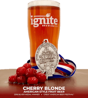 Ignite Brewing Company received a silver medal at the 2018 Great American Beer Festival® (GABF) in the American-Style Fruit Beer category for our very own Cherry Blonde. This award-winner is made with Michigan tart cherries and our Matchstick Blonde beer. Presented by the Brewers Association, GABF is the largest commercial beer competition in the world and recognizes the most outstanding beers produced in the United States.